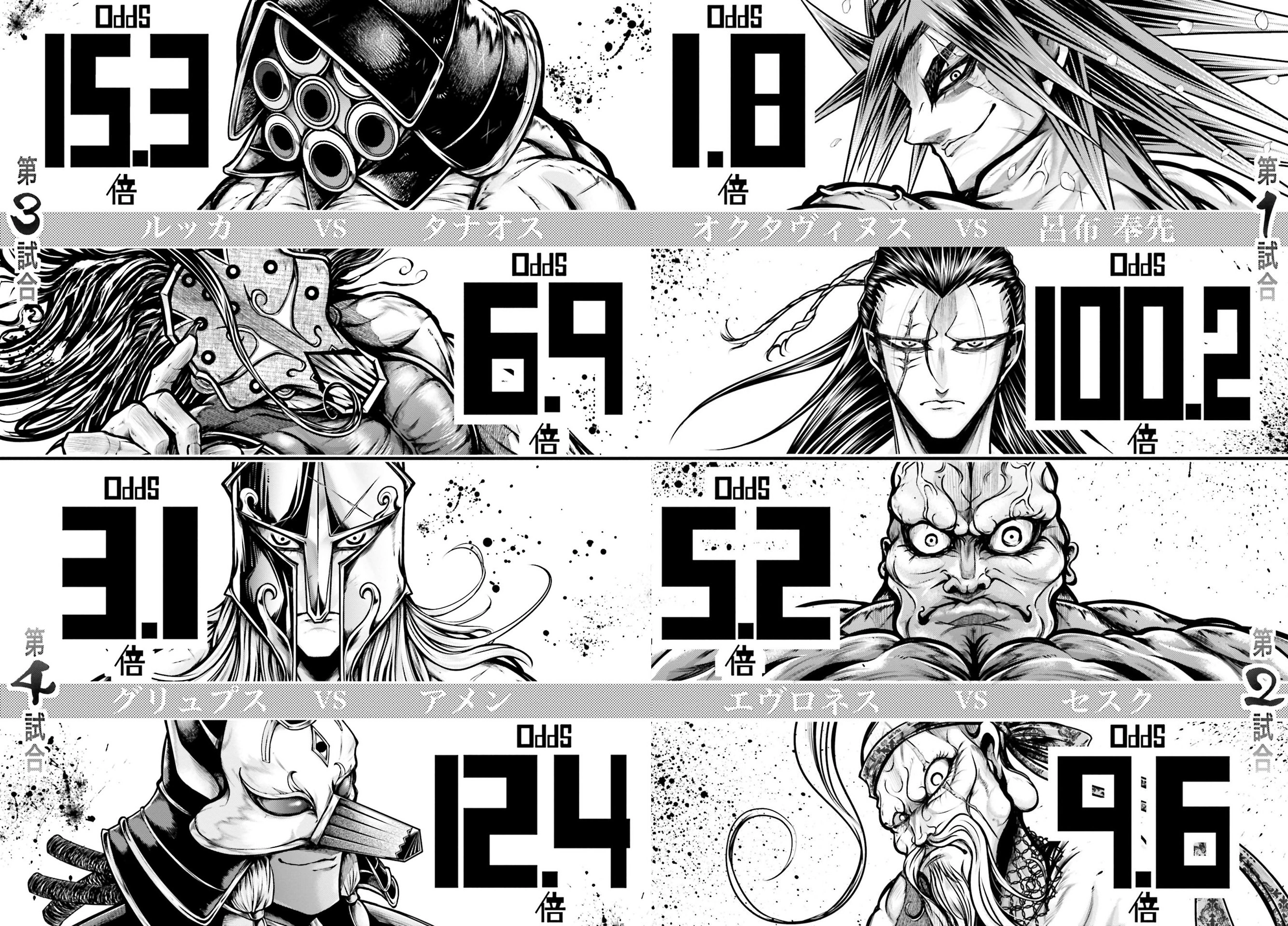 The Coro siblings redirect the audience’s attention to the top of the coliseum, where a massive stone displays the odds for each fighter's chances of winning the tournament. Gasps ripple through the crowd as the odds for the first fight are revealed: Lü Bu, 100.2, and Octavius, 1.8. Among the spectators, Lucius is seen fervently praying for Lü Bu’s victory, having bet on him. His sister, Yuria, scolds him sharply for such reckless behavior.