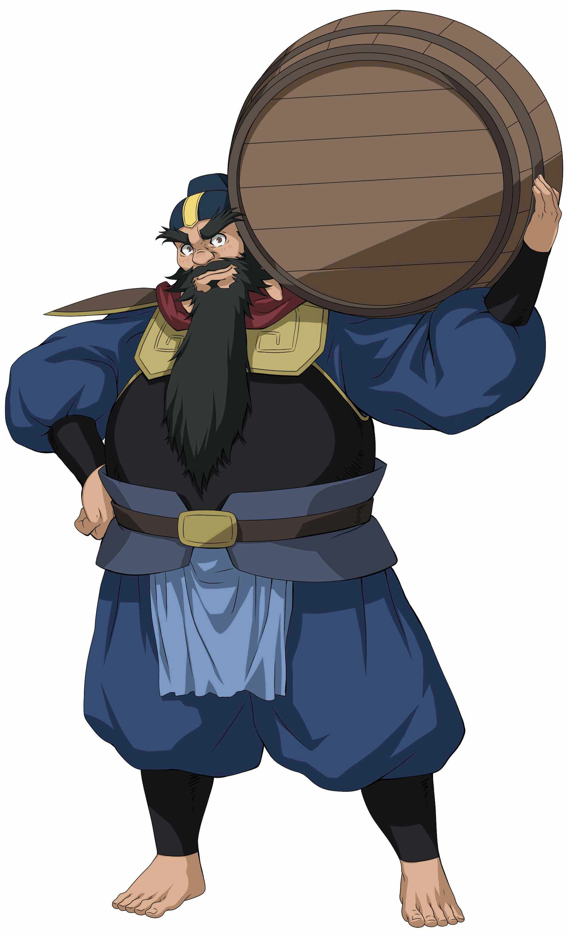 Zhang Fei has black hair and eyes. He has a round belly and a big nose. He possesses a long black beard and has long black hair, besides that he also has very thick eyebrows. When it comes to clothing, he wears a military uniform with pieces of armor.